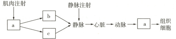 2. 试题调研原创 梅尼埃病是一种表现为反复发作的眩晕、听力下降,并伴有内耳内淋巴积水的慢性疾病,临床上常采用注射糖皮质激素和利尿剂的方法来减轻内耳炎症(炎症是一种局部反应,是机体对损伤或感染的防御反应)、内淋巴积水,促进积液排出,从而改善眩晕症状。下图表示两种注射方式的过程,a、b、c表示不同的体液(其中b为血浆)。回答下列问题: