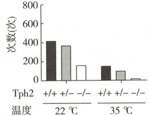 注:Tph2+/+、Tph2+/-、Tph2-/-分别为野生型(含正常量的5-HT)、杂合突变型(含减量的5-HT)、纯合突变型(缺乏5-HT);本实验环境温度为22℃(室温)、35℃(也是小鼠体温)。