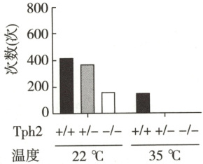 (2)为研究5-HT在“亲母行为”中的作用,研究人员构建了敲除色氨酸羟化酶2(Tph2)基因的小鼠(Tph2是脑内合成5-HT所必需的)。研究人员在不同温度环境下将小鼠幼崽与母亲分开,检测小鼠发出的特定超声波的次数(已有研究证明小鼠会发出该超声波吸引母亲,求她们回来照顾幼崽),结果如图: