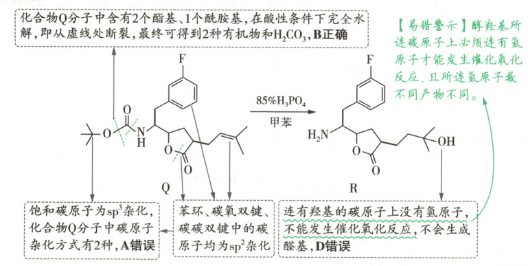 化合物Q分子中含有2个酯基、1个酰胺基,在酸性条件下完全水解,即从虚线处断裂,最终可得到2种有机物和H₂CO₃,B正确
