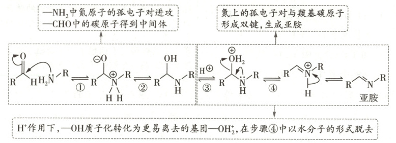 电子效应能增强羰基碳原子的正电性,加快反应速率,C 正确。适量 H⁺能促进羟基的质子化,有利于脱水生成亚胺,但亚胺作为醛与胺缩合的产物,在水中容易发生水解反应转化为相应的醛,酸性条件会促进亚胺的水解,故盐酸浓度不能过高,D 错误。