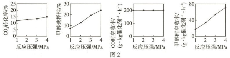 随着压强的增大,$ CO_{2} $的转化率增大,甲醇的时空收率和选择性也增大,但是CO的时空收率几乎不变,CO选择性下降,说明甲醇是由$ CO_{2} $直接加氢转化而来,$ CO_{2} $不必转化为CO