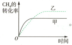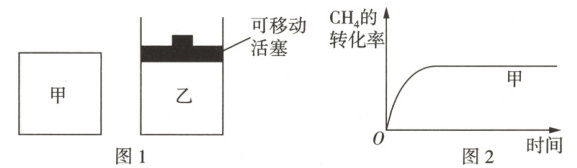 ② 在图 1 所示甲、乙两容器中均充入等物质的量的 $ {CH_{4}} $ 和 $ {CO_{2}} $,使甲、乙两容器初始容积相等,在相同温度下只发生反应 (ⅰ),并维持反应过程中温度不变。已知甲容器中 $ {CH_{4}} $ 的转化率随时间的变化关系如图 2 所示,请在图 2 中画出乙容器中 $ {CH_{4}} $ 的转化率随时间变化关系的图像。