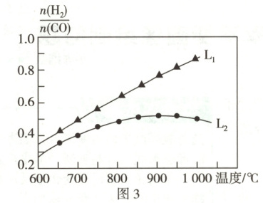 ③ 在密闭容器中加入一定量的 $ {CH_{4}} $ 和 $ {CO_{2}} $,发生反应 (ⅰ)(ⅱ),测得在不同投料比 $ \dfrac{n({CO_{2}})}{n({CH_{4}})} $ 下,平衡时 $ \dfrac{n({H_{2}})}{n({CO})} $ 随温度的变化如图 3 所示。比较图 3 中 $ {L_{1}} $、$ {L_{2}} $ 对应的投料比 $ \dfrac{n({CO_{2}})}{n({CH_{4}})} $:$ {L_{1}} $ (填“$ > $”或“$ < $”) $ {L_{2}} $。曲线 $ {L_{2}} $ 中,当温度高于 $ 900 \ ^{\circ}C $,$ \dfrac{n({H_{2}})}{n({CO})} $ 减小的原因可能是 。