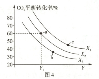 (4) ① 反应 Ⅰ 为反应前后气体分子数减小的放热反应,反应 Ⅱ 为反应前后气体分子数不变的吸热反应,增大压强,反应 Ⅰ 平衡正向移动,反应 Ⅱ 平衡不移动,$ {CO_{2}} $ 的平衡转化率增大,由题图 4 可知,随着 $ Y $ 的增大,$ {CO_{2}} $ 的平衡转化率逐渐减小,故 $ Y $ 表示温度,$ X $ 表示压强。
