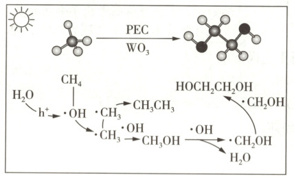 原创预测 2024年11月17日,大洋钻探船“梦想”号正式建成入列。它具备先进的深海探测与取样能力,计划前往南海开展钻探试验任务。此次钻探试验的重要任务之一是为后续天然气水合物(可燃冰)试采,助力我国海洋能源开发。随着可燃冰开采技术的迅速发展,甲烷成为用于生产高附加值化工产品的碳原料。在WO₃催化作用下,CH₄通过光电化学(PEC)转化可制得乙二醇,其反应机理如图所示。图中h⁺表示WO₃被光激发出电子之后产生的空穴。下列说法正确的是