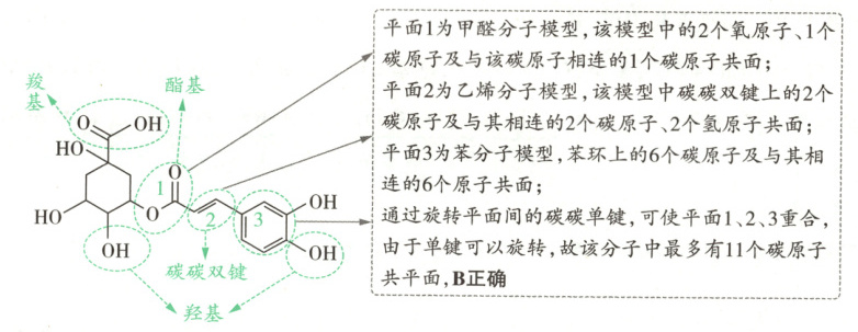 由上述分析可知,该分子中含有羟基、羧基、酯基3种含氧官能团,A正确。该物质分子中含有1个苯环、1个碳碳双键、2个碳氧双键和1个六元环,则其不饱和度为8,故该物质可能存在含有两个苯环的同分异构体,C正确。1 mol羧基、1 mol酯基和2 mol酚羟基分别能和1 mol、1 mol和2 mol NaOH发生反应,因此1 mol绿原酸最多消耗4 mol NaOH,D错误。