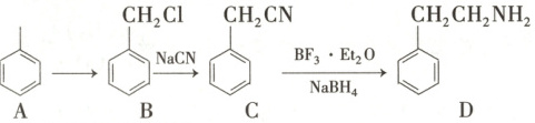 (3) 化合物 A、B 中的饱和碳原子上均连有多个氢原子,不是手性碳原子,A 正确;化合物 D 分子中含有氨基,能与水分子形成分子间氢键,但是该分子中烃基占比很大,且烃基是疏水基团,故化合物 D 不易溶于水,B 错误;化合物 C 中存在 —C≡N—,化合物 C 转化为化合物 D 时,有 π 键断裂,但该反应是加氢的还原反应,C 错误;化合物 C 中,苯环上的碳原子的杂化方式为 sp²,亚甲基中碳原子的杂化方式为 sp³,氰基中碳原子的杂化方式为 sp,D 正确。