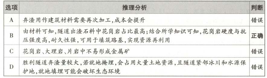 2024年12月30日,世界最长高速公路隧道——乌鲁木齐至尉犁高速公路天山胜利隧道(图1)顺利贯通,全长22.13千米,驾车仅需约20分钟即可穿越天山。该隧道是国内在建高速公路中典型的特长高寒、高海拔公路隧道,地质环境复杂,且紧邻天山1号冰川和乌鲁木齐水源保护地,生态环保标准极高。胜利隧道施工时设置了4处竖井(图2),出渣石料中花岗岩占比最高,其余基本为大理岩、片岩等。据此完成1—3题。