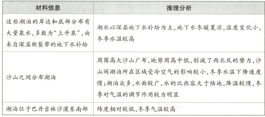 (2)湖水以深层地下水补给为主,地下水(泉水)温度变化小,冬季水温较高;四周高大沙山广布,削减寒冷西北风的势力,沙山间湖泊区气温较高;东南部纬度相对较低,冬季气温较高;湖泊众多,水面较广,冬季对气温的调节作用较为明显。(每点2分,任答3点即可)