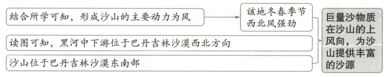 (1)该地冬春季节盛行西北风,风力强劲;黑河中下游位于沙山的西北方向,受西北风影响,为沙山的形成提供大量沙源。(每点2分)