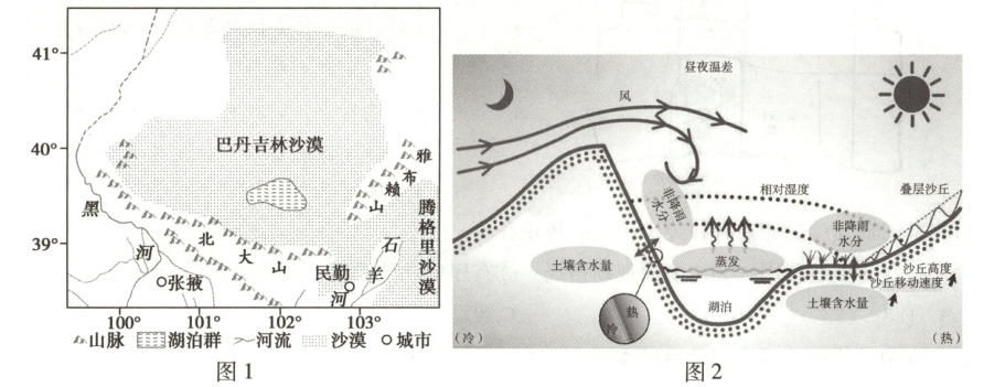 (3)本题要注意限制性分析角度——湖泊的作用。读图可知,湖水蒸发为上方空气提供大量水汽,沙丘背风坡气流形成的风影区也利于延长水汽留存时间;沙漠地区的昼夜温差及沙丘表面和内部的温差有利于空气中的水汽凝结,渗入沙丘;沙丘表层变得湿润,沙粒之间摩擦力变大,进而减缓主体沙丘的移动,最终使主体沙丘体积增大。