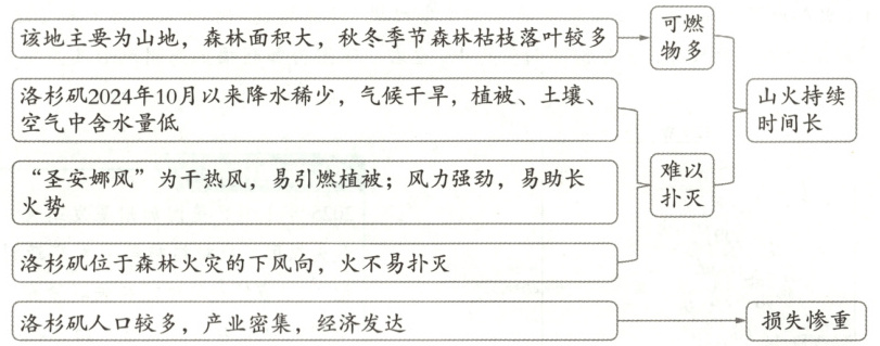 (2)干热风“圣安娜风”盛行,易引燃植被,引发火灾,且风力强劲,易助长火势;当地森林面积大,枯枝落叶多;2024年秋冬季气候干旱,植被、土壤、空气含水量低,植被更易燃;洛杉矶位于森林火灾的下风向,火不易扑灭;洛杉矶人口较多,产业密集,经济发达,造成的损失大。(每点2分,任答3点即可)