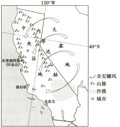 美国加利福尼亚州是一个山火多发地区,2025年1月,该州洛杉矶山火肆虐近20天,逾1.6万栋建筑和超222平方千米的土地被烧毁,美国某天气预报公司预计,此次山火或成为美国史上损失最为严重的自然灾害。秋冬季节,该地盛行一种叫作“圣安娜风”的季风,它发源于美国西部内陆大盆地,翻越高山,穿过山谷,最终到达沿海地区。干热的“圣安娜风”对加州山火起增强作用,这次山火暴发前后,“圣安娜风”时速超过160千米。洛杉矶2024年10月以来的降雨量只有正常年份降雨量的4%左右。下图为加利福尼亚州地形及圣安娜风示意图。