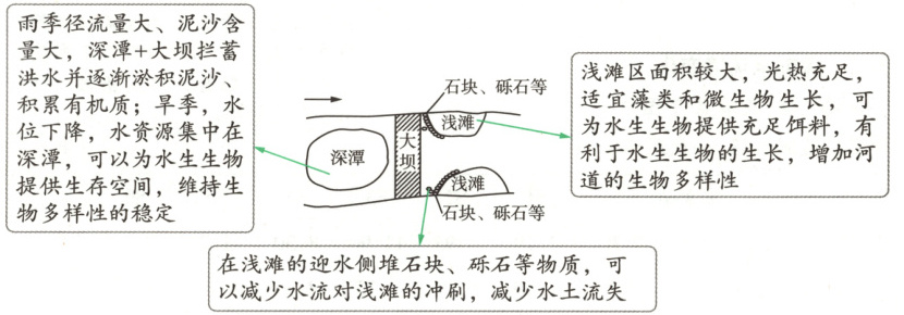 (3)深潭和大坝拦蓄洪水并逐渐淤积泥沙,积累有机质,在干旱季节能将有限的水资源集中,为水生生物提供生存空间,维持生物多样性的稳定。(2分)浅滩区面积较大,光热充足,可为藻类和微生物等提供广阔的生存空间,为水生生物提供充足饵料,有利于水生生物的生长,增加河道的生物多样性。(2分)堆砌的石块、砾石等物质,可以减少水流对浅滩的冲刷,减少水土流失。(2分)