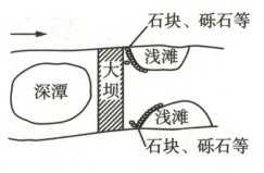 针对贾鲁河水土流失、物种退化等问题,某科研小组提出了一种多形态组合的生态修复技术——深潭浅滩构建技术。该技术通过工程手段塑造河床微地形,在坝前设置2—5m深水区,后将开挖深沟的土方用于构建坝后浅滩区,浅滩高出原河底0.1—0.3m,形成河边滩,并在浅滩的迎水侧堆石块、石灰岩、砾石等物质(如图,图中箭头表示河流流向)。