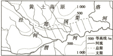 (1)从图中等高线分布可以看出,泾河的海拔高于洛河,郑国渠引泾河水自西向东流向洛河才可实现自流。