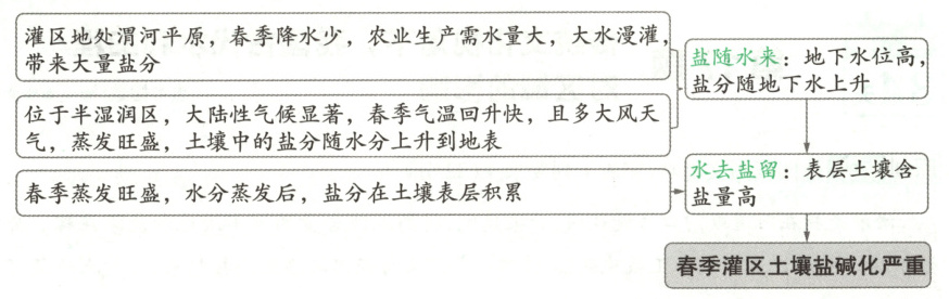 (2)春季。(2分)原因:春季大水漫灌,带来盐分并导致地下水位上升;春季气温回升快,且多大风天气,蒸发旺盛,地下盐分随水分上升;水分蒸发后,盐分在地表集聚。(每点2分)