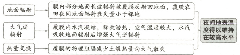 (2)夜间地面以长波辐射形式散热,覆膜阻挡部分长波辐射穿透,减少热量散失;覆膜阻隔土壤与大气间的直接接触,减少热量通过空气对流和土壤传导流失;覆膜内水汽凝结释放潜热,使局部大气增温,间接增强局部大气逆辐射,进一步减缓地表降温。(每点2分)
