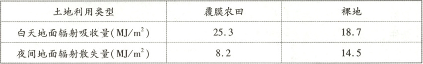 (1)覆膜农田白天地面辐射吸收量(25.3 $MJ/m^{2}$)显著高于裸地(18.7 $MJ/m^{2}$),差值达6.6 $MJ/m^{2}$;(2分)覆膜农田夜间地面辐射散失量(8.2 $MJ/m^{2}$)明显低于裸地(14.5 $MJ/m^{2}$),差值达6.3 $MJ/m^{2}$;(2分)一天中覆膜农田地面辐射净收入17.1 $MJ/m^{2}$,高于裸地的净收入4.2 $MJ/m^{2}$,差值达12.9 $MJ/m^{2}$。(2分)