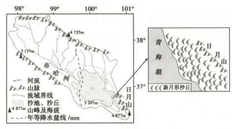 解析 1. 湖泊东南部的湖滨沙地与沙丘距离近,受盛行风影响,其沙源和沙丘可能相同,A错误;湖泊西北部有多条河流汇入,形成河流三角洲,该地盛行西北风,三角洲位于沙丘的上风向,故形成沙丘的沙源主要为湖泊西北部的河流三角洲,B正确;由材料可知,该地盛行西北风,沙丘集中分布于日月山西侧,故形成沙丘的沙源不可能来自日月山的沙质堆积物,C错误;湖泊西部河流的上游流速快,河谷深,泥沙沉积少,D错误。