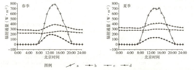 原创预测 下图为黄河源区高寒湿地某地面观测站(96°23'E,35°02'N,海拔4313m,年均降水量380—470mm)某年春季和夏季太阳辐射、地面反射太阳辐射、地面长波辐射和大气逆辐射的通量观测结果。据此完成1—2题。