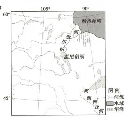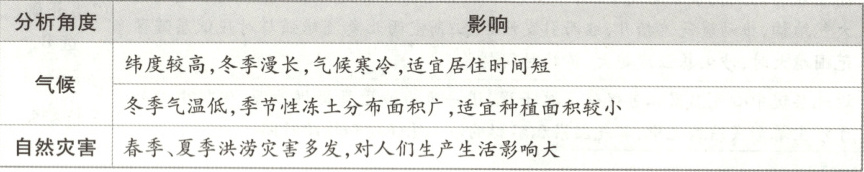 (3)纬度较高,冬季漫长,气候寒冷;有大面积季节性冻土分布;洪涝灾害多发。(每点2分)