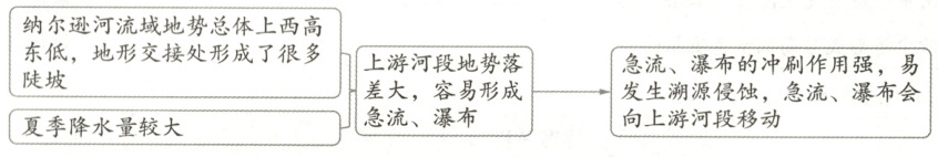 (2)上游河段。(2分)受溯源侵蚀影响,急流、瀑布均向上游河段移动。(2分)