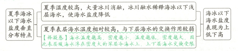 (4) 夏季温度高、海冰融化量大,可从这两方面分析其对海水盐度的影响,具体如下: