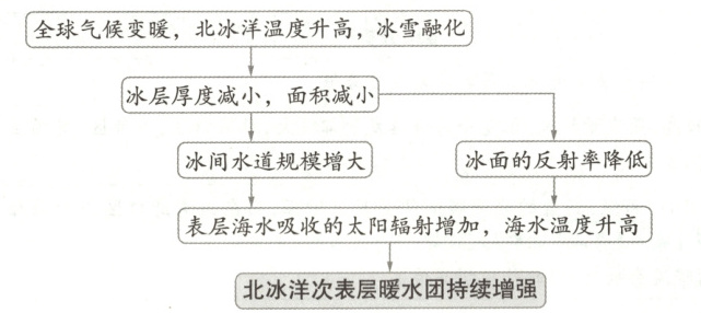 (3) 气候变暖,冰层厚度减小,冰间水道规模增大;冰层厚度减小,透过冰层的太阳辐射量增大,加速了海水的升温;冰间水道规模增大,冰体表面对太阳辐射的反射减少,导致海水温度进一步升高。(每点2分)