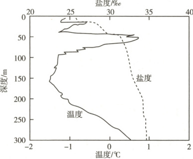 在北冰洋加拿大海盆冰下出现的温度较高的暖水团被称为北冰洋次表层暖水团,其形成主要受海冰厚度和冰间水道(在流冰中裂开的一条可供航行的通道)规模影响。近年来,随着全球气候变暖,北冰洋次表层暖水团持续扩张。右图为加拿大海盆中一测量点(位于75°N,155°W附近)海水盐度及温度垂直分布统计图。