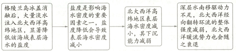 (1)冰盖融化,大量淡水注入北大西洋高纬地区,高纬地区表层海水盐度降低;盐度降低造成海水密度减小;表层海水下沉能力减弱;深层水南移驱动力不足;北大西洋经向翻转环流强度减弱,北大西洋暖流势力衰退。(每点 2 分)
