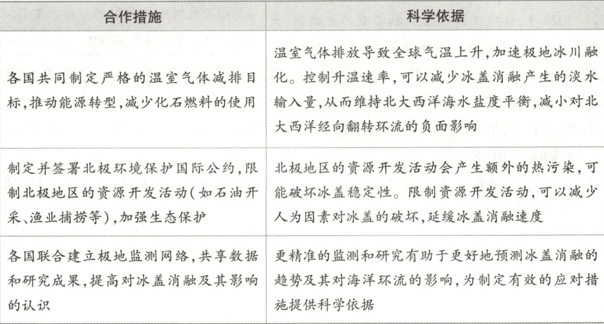 ③措施:联合建立极地监测网络。依据:预测冰盖消融的趋势及其对海洋环流的影响,为制定有效的应对措施提供科学依据。(每点 4 分,任答 2 个措施及对应依据即可)