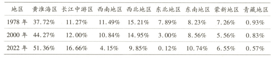 全球变暖背景下,厄尔尼诺事件频发,逐渐改变我国气候资源的时空格局:北方气温增幅明显高于南方,而南方日照减幅则明显大于北方,“南涝北旱”的降水差异持续加大。这些变化进一步影响我国小麦的生产分布。下表示意1978—2022年我国各区域小麦播种面积占全国小麦播种总面积的比重。