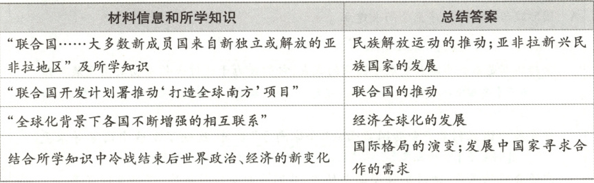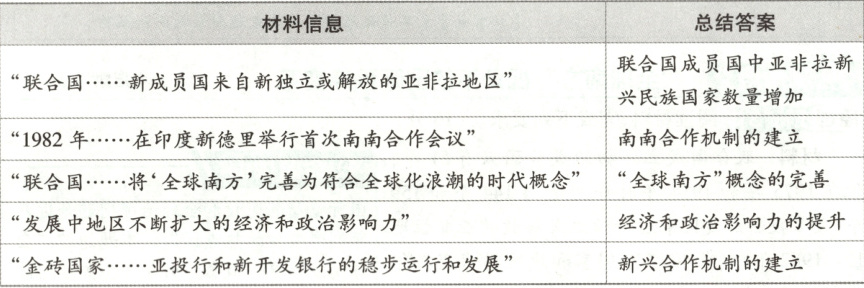 (2)表现:联合国成员国中亚非拉新兴民族国家数量增加;南南合作机制的建立;“全球南方”概念的完善;新兴合作机制的建立;新兴市场国家和发展中国家经济和政治影响力的提升。(4 分,任答 2 点即可)