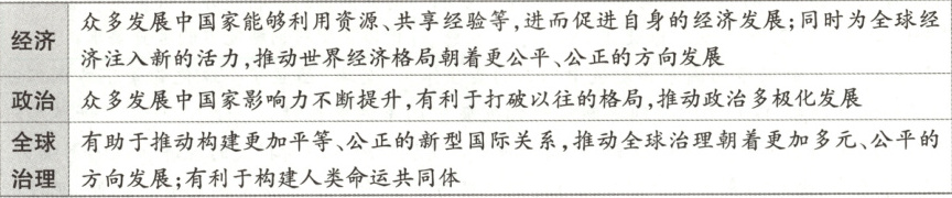 影响:有利于新兴市场国家和发展中国家的经济发展;促进全球经济发展,推动世界经济格局朝着更公平、公正的方向发展;提升了发展中国家在国际政治舞台上的话语权,有利于政治多极化发展;有助于构建更加平等、公正的新型国际关系;推动全球治理朝着更加多元、公平的方向发展;有利于推动构建人类命运共同体。(6 分,任答 3 点即可)