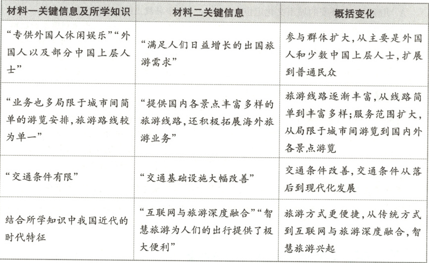 (1)变化:参与群体扩大,从主要是外国人和少数中国上层人士,扩展到普通民众;旅游线路逐渐丰富,从线路简单到丰富多样;交通条件改善,交通条件从落后到现代化发展;服务范围扩大,从局限于城市间游览到国内外各景点游览;旅游方式更便捷,从传统方式到互联网与旅游深度融合,智慧旅游兴起。(6分,任答3点即可)