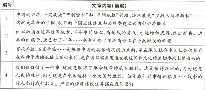 答案(1)时间顺序:2、1、4、3。(2分)理由:文章2写于土地革命战争时期,这一时期毛泽东领导创建了农村革命根据地,开展土地革命,“红军”“边界的红旗子”反映了这一时期的典型特征。(2分)文章1写于全国抗战时期,毛泽东在这一时期系统阐述了新民主主义理论,“节制资本”