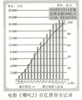 2024年我国电影票房变化的原因:消费方式的转变,娱乐方式更加多元化,分流了可能去电影院观影的人群;收入是消费的基础和前提,消费心理影响消费行为,在经济等多种因素影响下,观众消费趋于理性。(每点2分,共4分。其他答案言之有理亦可酌情给分)《哪吒2》居全球票房榜TOP10的原因:用现代语言重构传统神话,具有强大的故事吸引力和文化底蕴,能满足观众的消费需求。(1分)依靠科技进步,提高自主创新能力,(1分)动画制作技术不断进步,影片在画面、特效等方面给观众带来了震撼的视觉体验,提升了影片的品质和观赏性,同时形成了良好的口碑和品牌效应。(1分)制定正确的经营和宣传战略,电影方的宣传推广吸引了更多观众走进影院。(1分)