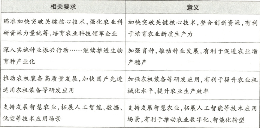 ①加快突破关键核心技术,整合创新资源,有利于培育农业新质生产力,提升农业发展的质量和效益。②加强育种,推动种业发展,有利于促进农业增产稳产,保障国家粮食安全和农业产业链自主可控。③加强农机装备等研发应用,有利于提升农业机械化水平,提升农业生产效率。④支持发展智慧农业,拓展人工智能等技术应用场景,有利于推动农业数字化、智能化转型,优化资源配置,减少资源浪费。(每点 2 分,共 8 分)