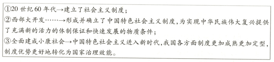 ①我国建立起社会主义制度,为当代中国一切发展进步奠定了根本政治前提和制度基础。②在改革开放的历史进程中,我们党领导人民不断实践探索,逐步形成并确立了中国特色社会主义制度,为实现中华民族伟大复兴提供了充满新的活力的体制保证和快速发展的物质条件。③党的十八大以来,中国特色社会主义进入新时代,我国各方面制度更加成熟更加定型,制度优势更好地转化为国家治理效能,为实现中华民族伟大复兴提供了更为完善的制度保证、更为坚实的物质基础、更为主动的精神力量。实践证明,中国特色社会主义制度是具有显著优越性和强大生命力的制度,保障我国创造出世所罕见的经济快速发展和社会长期稳定两大奇迹。(每点2分,共6分)