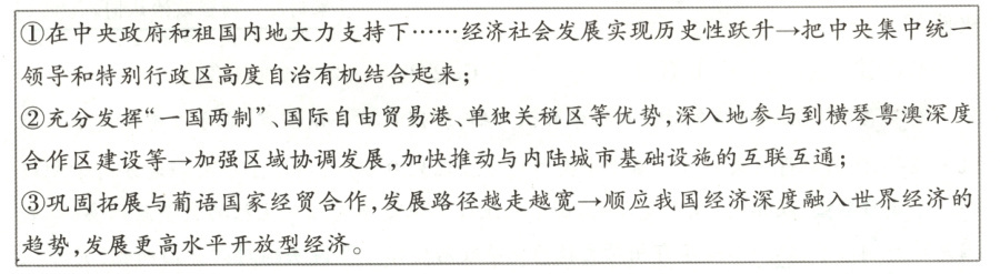 答案 ①在中央集中统一领导下,澳门积极贯彻新发展理念,加强区域协调发展,加快推动与内陆城市基础设施的互联互通,大力推进横琴粤澳深度合作区建设,积极参与粤港澳大湾区建设,不断增强发展的整体性。(3分)②顺应我国经济深度融入世界经济的趋势,遵循共商共建共享的基本原则,深度参与“一带一路”建设,推动与共建国家和地区开展多领域的务实合作,打造参与全球竞争的重要空间载体,发展更高水平开放型经济。(3分)③在坚持“一国”前提下,充分发挥自治功能,把中央集中统一领导和特别行政区高度自治有机结合起来,把发挥祖国内地坚强后盾作用和提高澳门自身竞争力有机结合起来。(2分)