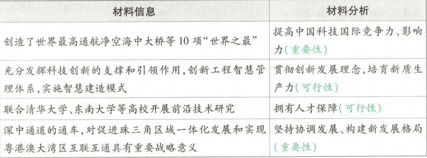 ①有利于擦亮中国基建国家名片,提高中国科技国际影响力和竞争力。②坚持创新驱动(或答“贯彻创新发展理念”),以科技创新引领新质生产力发展,打造智慧深中通道。③携手高校汇聚合力,为深中通道建成提供坚实人才保障。④坚持协调发展,打通区域发展“堵点”,推动构建新发展格局。(每点2分,共8分)