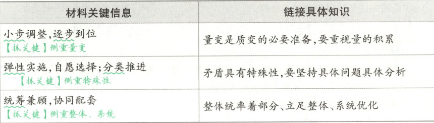 ①量变是质变的必要准备,要重视量的积累,为实现事物的质变创造条件。该方案以较小幅度逐步推进延迟退休年龄,强调循序渐进做好延迟退休改革工作。②矛盾具有特殊性,要求我们坚持具体问题具体分析。延迟退休改革方案考虑到了不同个体、不同群体、不同行业的差异,允许一定的灵活性,强调对不同情况采取不同措施推进延迟退休工作。③整体居于主导地位,整体统率着部分,要树立全局观念,掌握系统优化的方法,用综合的思维方法认识事物。延迟退休工作是一个系统工程,该方案充分考虑到需要配套和保障政策措施协调推进。(每点3分,共9分)