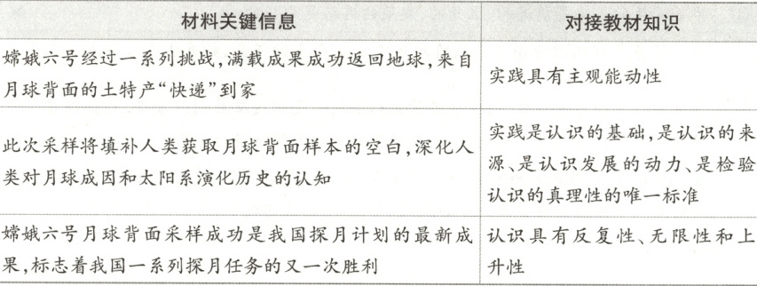 答案 ①实践具有主观能动性。嫦娥六号经过一系列挑战,满载成果成功返回地球,来自月球背面的土特产“快递”到家。(2分)②实践是认识的基础,是认识的来源、发展动力和目的,是检验认识的真理性的唯一标准。嫦娥六号月球背面采样能够成功,是航天人在科学实验中积累、总结、探索出来的,航天人在航天科学实验中不断检验技术、发现问题,进而对其加以改进完善。(3分)③追求真理是一个过程,我们要在实践中认识和发现真理,在实践中检验和发展真理。嫦娥六号月球背面采样将深化人类对月球成因和太阳系演化历史的认知,把我国探月工程推向又一个高峰。(3分)