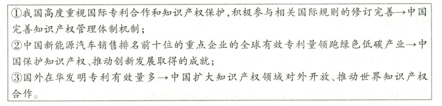 答案 示例 ①知识产权保护是创新发展的重要支撑,也是各国共同面临的全球性问题。②中国高度重视国际专利合作和知识产权保护,不断完善知识产权管理体制机制,已经成为世界创新版图的重要一极。③中国不断扩大知识产权领域对外开放,持续营造市场化、法治化、国际化一流营商环境,国外申请人在华开展商业活动和知识产权布局意愿不断增强。④中国呼吁加强与各国在知识产权领域的国际交流与合作,推动全球知识产权治理向着更加公正合理的方向发展,让创新更多惠及各国人民,推动构建人类命运共同体。(答案不固定,言之有理即可酌情给分,共7分)