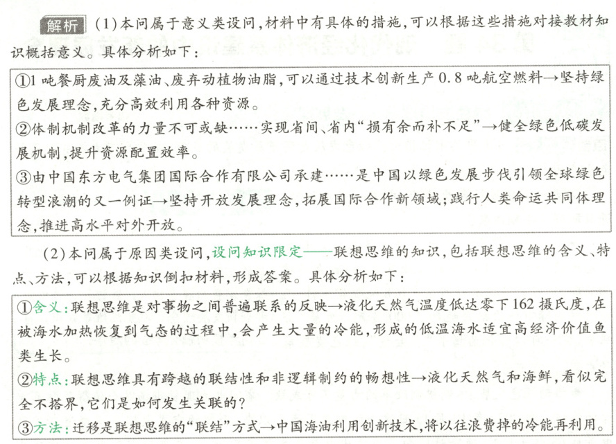 答案(1)①贯彻落实绿色发展理念,充分高效利用各种资源,推动企业转型升级,实现经济效益和创新能力双提升。②健全绿色低碳发展机制,提升资源配置效率,推动自然财富、生态财富转化为社会财富、经济财富。③坚持开放发展理念,拓展国际合作新领域,提高国家综合实力,增强国际竞争力。④开展国际绿色合作,引领全球绿色转型,践行人类命运共同体理念,推进高水平对外开放。(每点3分,共12分)(2)①联想思维是对事物之间普遍联系的反映。我国看到了液化天然气冷能与低温海水养殖高经济价值鱼类之间的联系,对相关事物的认识进行联结,为绿色技术的跨界应用创造了可能。(2分)②联想思维具有跨越的联结性和非逻辑制约的畅想性。中国海油利用创新技术,将液化天然气与海鲜进行联结,拓展了新思路,打破了常规,使不可能变为现实。(3分)③迁移是联想思维的“联结”方式。我国将液化天然气被海水加热产生冷能,最终形成的低温海水适宜高经济价值鱼类生长的规律迁移至大鹏液化天然气接收站中使用,找到了解决问题的新思路,展现了绿色技术的“跨界出圈”。(3分)