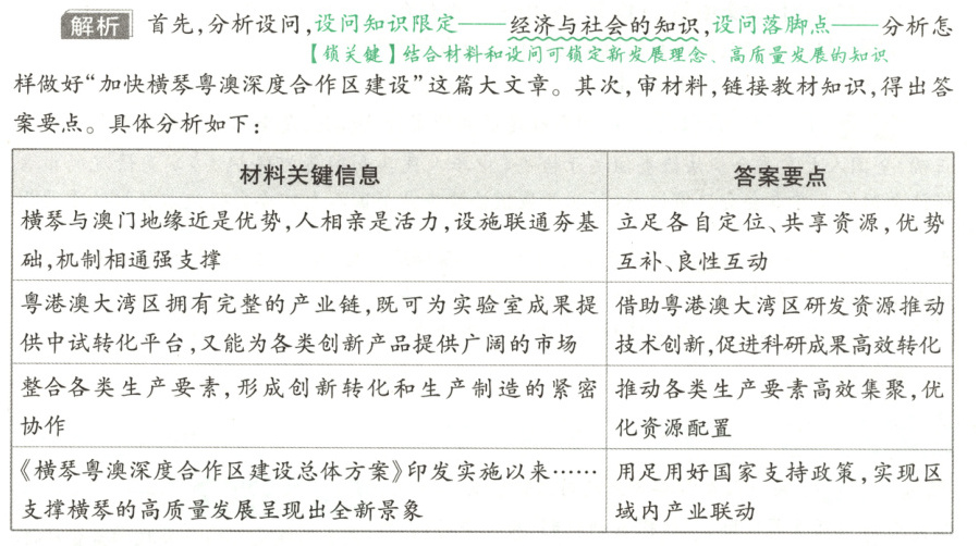 答案①立足各自定位、共享资源,充分发掘发展潜力,优势互补、良性互动,助推横琴粤澳深度合作区建设;②借助粤港澳大湾区研发资源推动技术创新,发展新质生产力,促进科研成果高效转化,提升区域核心竞争力;③促进各方同向发力、人才相互流动,推动各类生产要素高效集聚,优化资源配置;④用足用好国家支持政策,实现区域内产业联动,促进区域协调发展,催生发展动力,培育创新动能,实现合作共赢、协同发展。(每点2分,共8分)