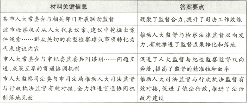 答案 ①该市人大常委会与相关部门开展联动监督,推进了部门优势互补,凝聚了监督合力,提升了司法工作效能。②推动人大监督与检察法律监督双向发力,有效推进了监督成果转化和落地。③促进了人大监督与纪检监察监督双向奔赴,进一步提高了监督的精准性和效率。④推动人大司法监督与行政执法监督有效对接,促进了依法行政,推进了法治政府建设。(每点2分,共8分)