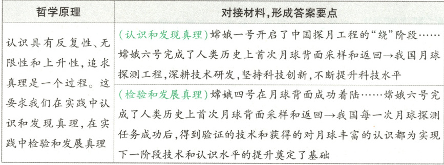 解析 本题以月球探测历程为背景,考查其中体现的“追求真理是一个过程”的相关知识。本题知识限定具体,材料层次分明,直接用哲学原理对接材料即可。具体分析如下: